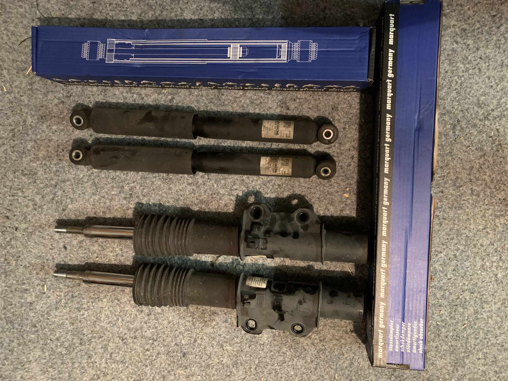 Am 15. Oktober 2024 war es dann soweit: Nach einem sehr informativen Telefongespräch und einem überzeugenden Angebot sind wir der Empfehlung gefolgt und haben die hinteren Monroe Originalstoß-dämpfer (siehe Foto) durch blaue Marquart Dämpfer in der Stufe 3 (Nr. 797131) und die beiden vorderen Federbeine durch Marquart Federbeine der Stufe 1 austauschen lassen.
