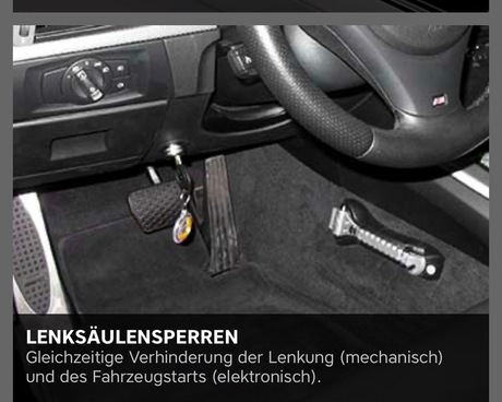 Diese Bear-Lock-Lenksäulensperre verhindert mechanisch die Lenkung des Fahrzeugs. Um Gefahren vorzubeugen und Unfälle zu vermeiden, ist sie zusätzlich mit einer elektronischen Einheit ausgestattet, die den Fahrzeugstart verhindert - hierbei wird je nach Fahrzeug die Zündung, der Anlasser, die Kraftstoffzufuhr etc. unterbrochen. Innerhalb von Sekunden erfolgt die bequeme Bedienung mit einem der Schlüssel. Das Fahrzeug wird effektiv vor Diebstahl geschützt, da die Wegfahrsperre aus gehärtetem Stahl und einem gekapselten Schloss gefertigt ist. Zudem ist sie pulverbeschichtet und wird mittels Abreiß-Schrauben bzw. -Muttern fest unter/hinter der Lenkradverkleidung an vorhandenen Punkten der Fahrzeugkarosserie befestigt.