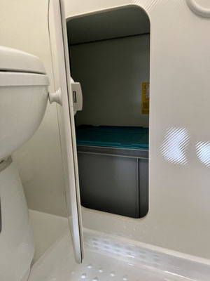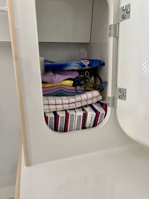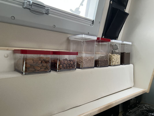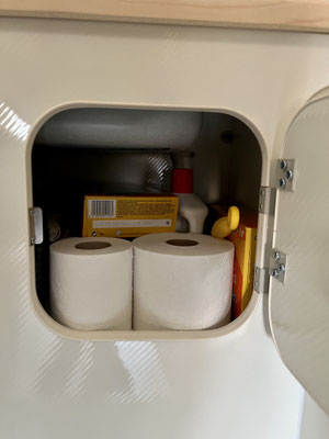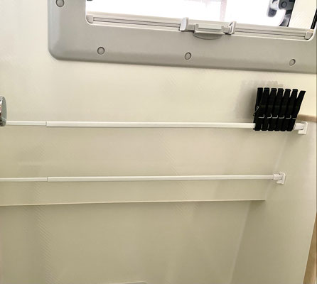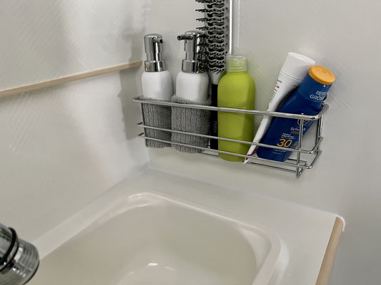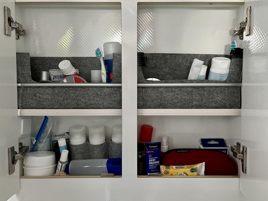 Der COSMO ist ein Raumwunder. Es gelingt uns nicht alle Stauräume zu füllen. Damit nichts klappert nutzen wir jetzt selbstgenähte Filztaschen. Im Bad gibt es jetzt zwei zusätzliche angeklebte ausziehbare Vitragenstangen. Diese sind stabil genug, um Trockentücher, Waschlappen, etc aufzuhängen.