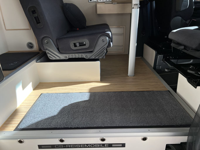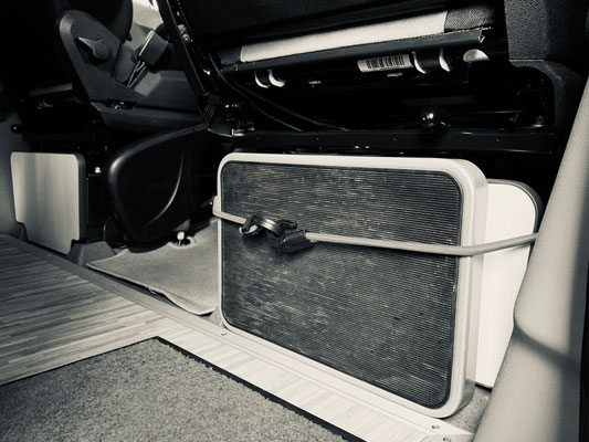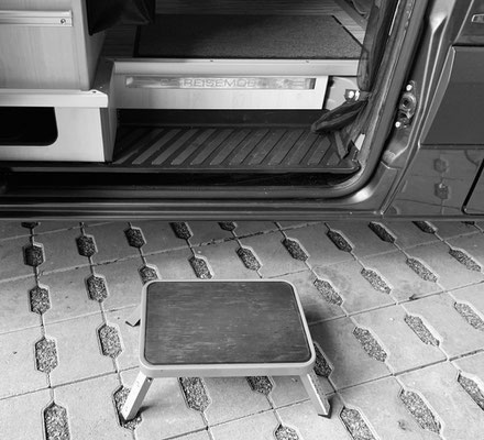 Ein stabiler Tritt aus Metall, der sich - direkt dort wo er benötigt wird - hinter den Beifahrersitz verstauen lässt.