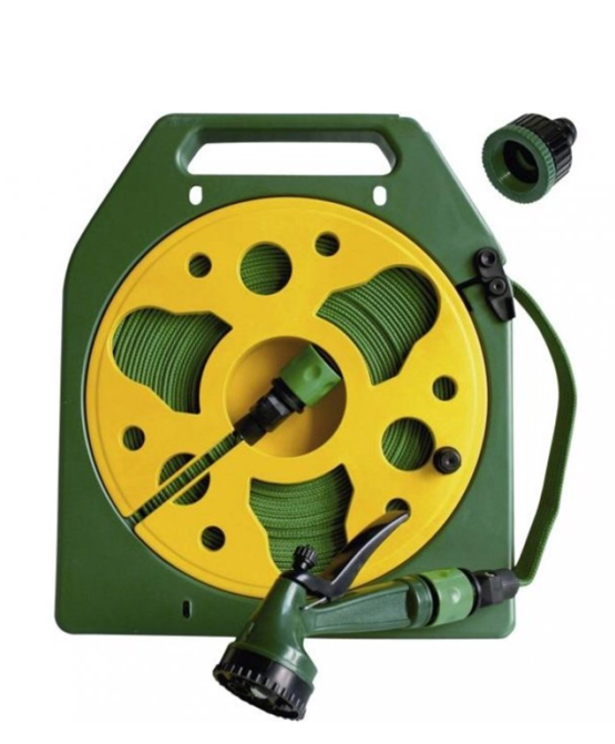 Der tolle platzsparende Flachschlauch hat den Praxistest nicht bestanden - liegt im Müll. Genutzt wird der Gardena  Spiralschlauch. (Foto: Reimo Katalog)