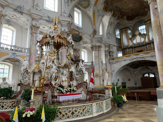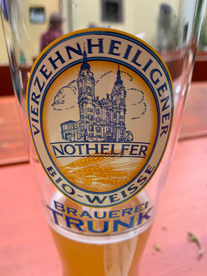 Besichtigung von Vierzehnheiligen. Auf dem Parkplatz sind wir allein. Am folgenden Morgen können wir die Basilika besichtigen und eine Brotzeit im Biergarten bekommen. Endlich wieder raus !