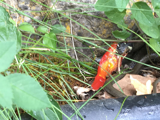besonderes. Uns ist ein tolles Foto gelungen von einer Ringelnatter, die sich gerade einen grossen GoldFisch aus einen kleinen Tümpel geholt hat. Die Natur nimmt sich zurück was